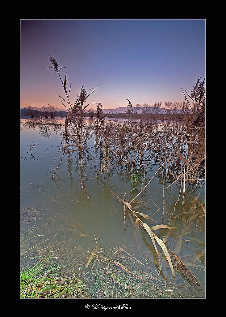 Molto bella, ma anche io volevo farti la stessa osservazione di Freedam; lì per lì addirittura l'alone bianco intorno alle foglie delle canne avevo creduto fosse brina illuminata in controluce; poi ho visto che l'effetto è presente anche nel riflesso dei rami spogli, su in alto a sinistra.