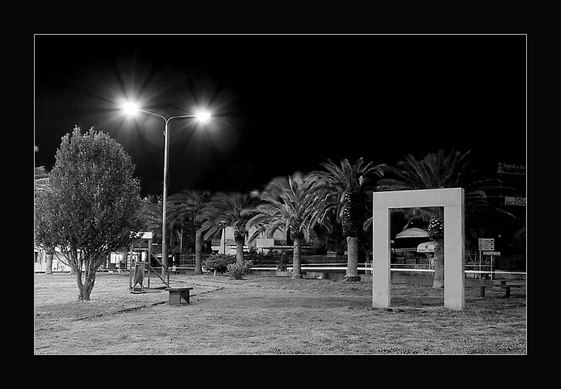 Tanti elementi di un giardino in notturna. Un po' preciso lo spazio a sinistra dell'albero.