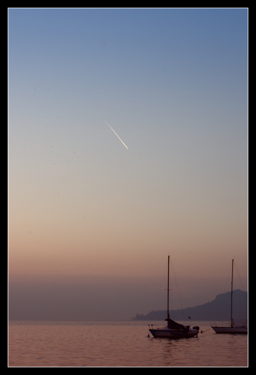 Peccato che qui l'inquadratura sia un pochino debole, secondo me naturalmente...La scia nel cielo è bellissima e conferisce un intenso fascino all'atmosfera della foto...peccato per il taglio della seconda barca...