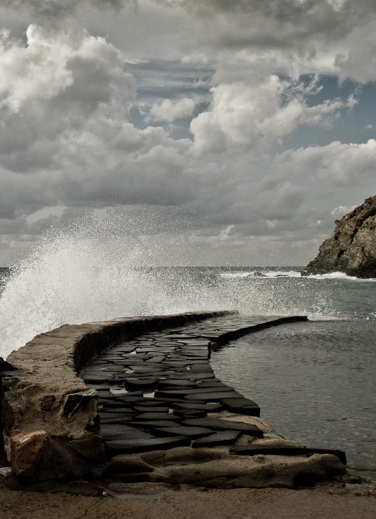 Bella la linea guida, lucida e arcuata, della passerella in pietre, e vitale la esplosione di spuma dell'onda spezzata.