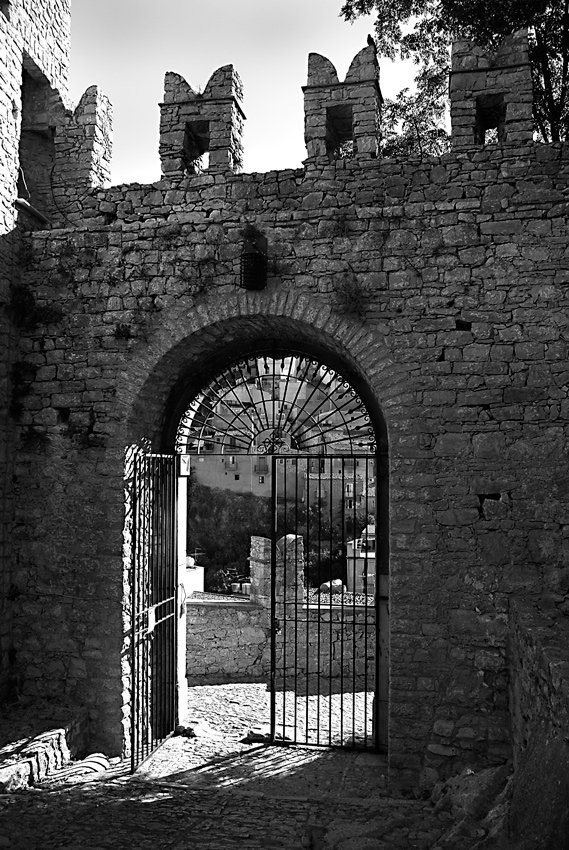 Buona la composizione con questa quinta merlata e luci ed ombre che guidano al di là del cancello aperto.
