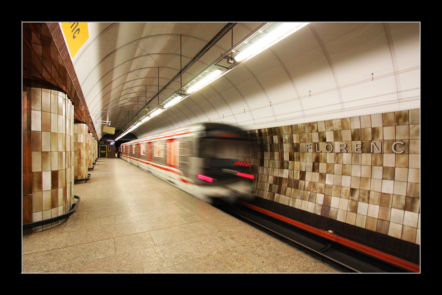 | Mosso ben riuscito. Disturba un po' l'almeno apparente "stortezza" del suolo, è molto piacevole la linea prospettica descritta dalla parete destra e dalle colonne, peraltro arrangiate in maniera gradevole da chi ha progettato quella stazione (cosa non comune). Tre fonti di disturbo le trovo nei tre aloni (in basso, sul pavimento; in alto, sul soffitto; in corrispondenza delle luci al neon) che forse si potevano evitare con un'esposizione differente. Il bordo interno della cornice è spiacevole; quello esterno, nero, ha l'inevitabile effetto di rendere più luminose e bianche le parti luminose e bianche, perciò non lo condivido completamente. Per il resto è una foto classica, dove un po' distrae il nome della stazione in giallo in alto a sinistra, che avrei troncato di meno o avrei troncato del tutto. |