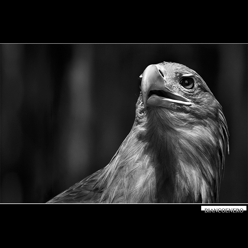 Stupendo B/N, ma c' è qualcosa che avrei cambiato, se ne avessi avuto l' opportunità specie se il pennuto era in cattività e l' avrei ricercata in più scatti per cogliere espressioni diverse, magari dall' alto in basso e più lateralmente , in modo da fissare un solo occhio o tutti e due.
