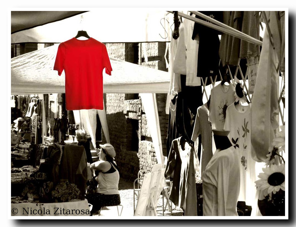 La maglia, rossa (e il rosso secondo me starebbe meglio con un bianco e nero "puro" senza viraggi, ma qua è gusto personale), sembra risaltare fuori dalla foto, specie se la si confronta con le maglie sulla destra, così nitide, troppo nitide per non essere considerate come quasi-soggetto, che in qualche modo (e qui iniziano le ricerche dell'occhio di chi osserva) sono insieme simili e distinte dalla maglia centrale.