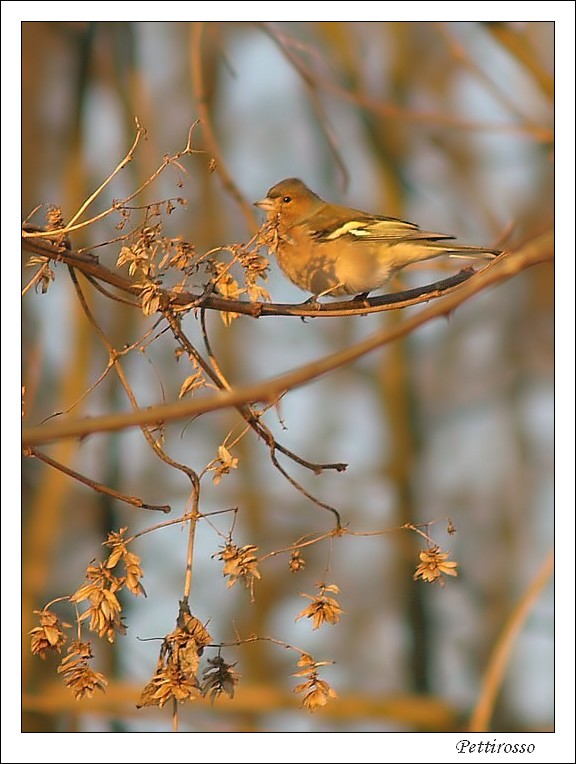 Bello scatto e gradevole nell'insieme. Non semplice da farsi visto gli innumerevoli elementi di disturbo e il fatto che il soggetto non resta in posa a lungo. Anche a mè sembra un fringuello e peccato per il rametto che copre in parte la testa, mà credo che non potevi gestire la cosa così facilmente.