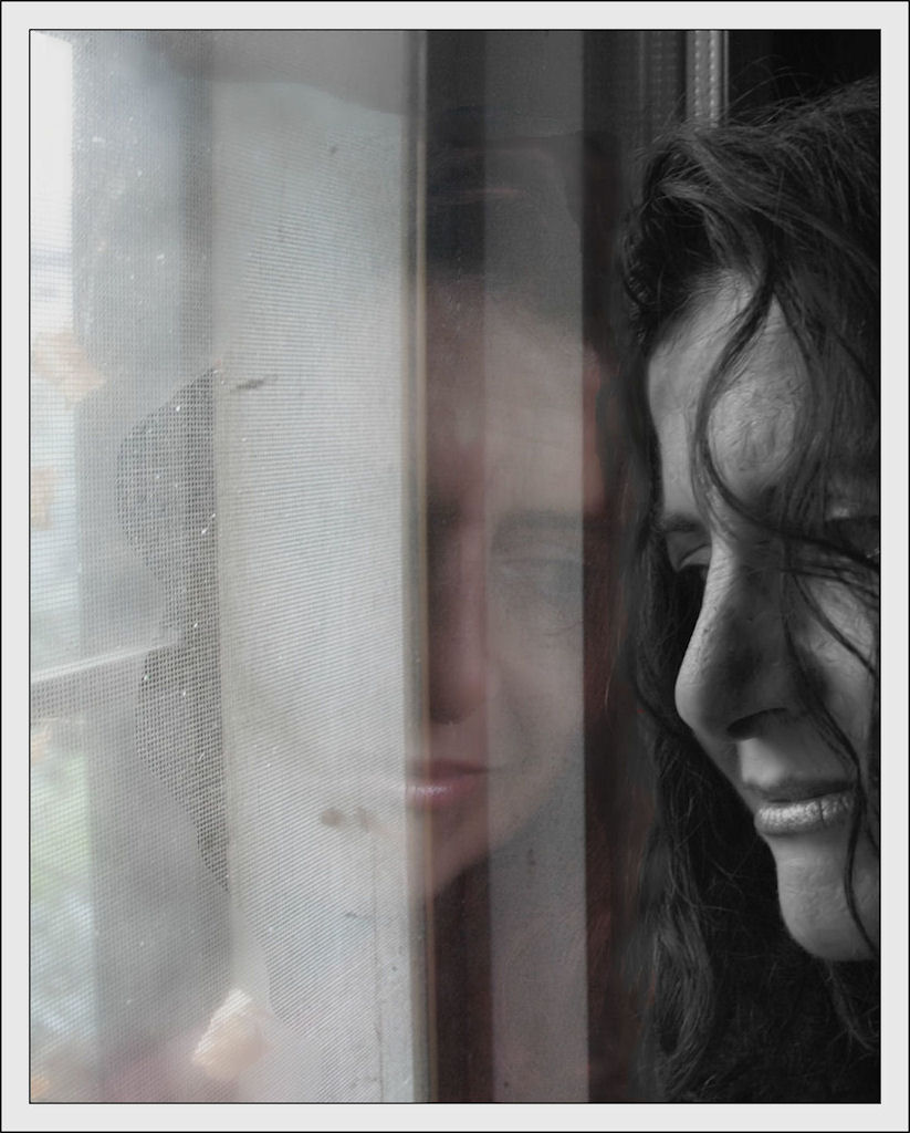 che bella questa foto.....per prima cosa splendida l'idea del bn e colore per il riflesso e poi l'immagine stessa...sembri tu in due diversi momenti, in una con un delizioso sorriso appena accennato e nel riflesso una velata tristezza che nonostante tutto non riesce a nascondere quel sorriso. Da entrambe esplode la tua belleza