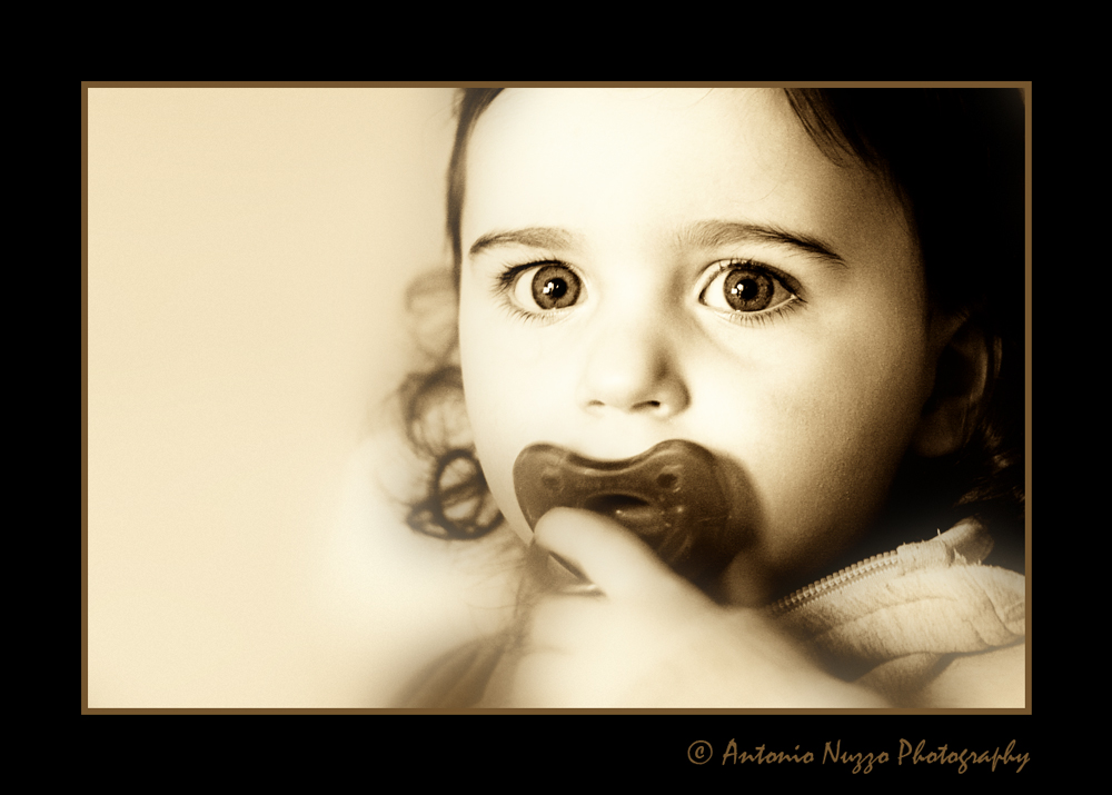 Personalmente non cambierei molte cose in questo scatto, lo sguardo con quegli occhioni è splendido, la sfuocatura sulla mano forse si un pelino eccessiva ma secondo me rende lo scatto dinamico sembra che vada a prendere il ciuccio per toglierlo dalla bocca.