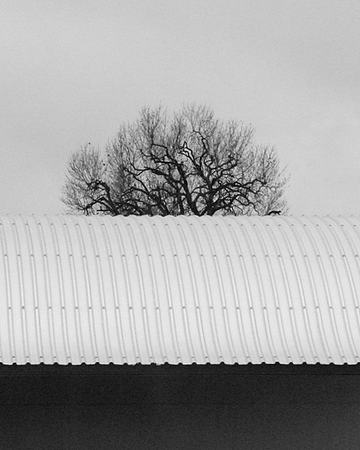 Grafismi vegetali in nero, tormentati contro il cielo grigio ... e sinuosità leggere sulla lamiera chiara, tacite e ordinate: