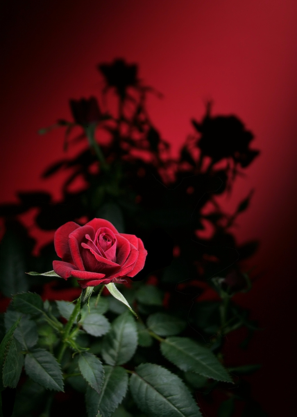 Mi piace l'idea di quell'incendio rosso in sfondo... il colore principe della giornata di San Valentino si scatena.. ma questa singola rosa esce in avanti, nitida e lucente e l'ombra frastagliata e scurissima fa da cortina di separazione; il fiore solitario trova il suo spazio, sembra quasi volersi mostrare come simbolo privato, personale,e dare il suo augurio affettuoso in tutta discrezione.