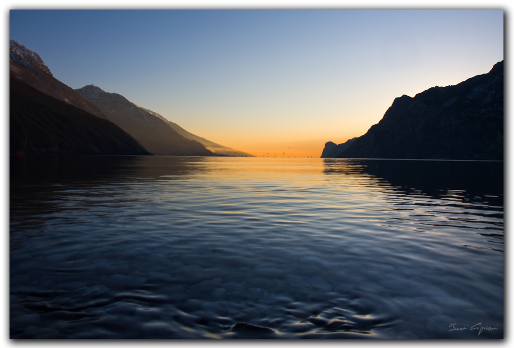 Per avere un punto di ripresa molto basso da esaltare e congelare il movimento dell'acqua in risalita sui sassi ho appoggiato la reflex sulla ghiaia a pochi cm dal lago ed ho attivato l'autoscatto in modalità live wiew; l'intenzione era proprio quella come dici te di registrare le increspature.