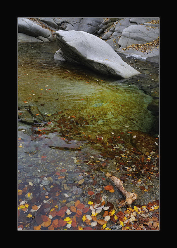 trovo bella e naturale la resa dell'acqua...bello pure il dualismo tra le foglie secche nell'acqua eppure ancora "vive" nei colori e quelle secche, arricciate tra le rocce in alto...