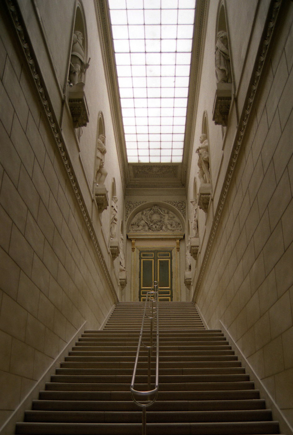 La patina che vedi, personalmente non la percepisco come tale perchè in effetti è la luce ( poca in questo caso ) a fare questo scherzo provenendo soltanto dalla vetrata in alto, rimanendo la scala del tutto incassata fra le pareti del " corridoio " e in quanto a nitidezza poi, la foto mi pare abbastanza leggibile, ma ad ognuno la sua opinione