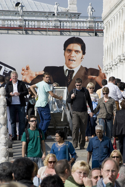 Mi piace molto di più dell'altro. Qui l'uomo del manifesto sembra voler richiamare a se la folla che sembra interessata a ben altro. Le persone in basso, a mio avviso, completano bene il quadro perchè hanno delle espressioni più significative delle altre.