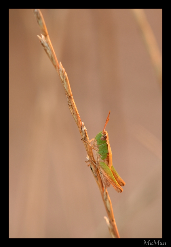 Immagine gradevole per il colore e la composizione. Peccato che il rosa dello sfondo pare abbia avvolto anche l'ortottero facendolo risaltare poco dal contesto. La maf è più precisa nella parte superiore mentre lo è meno nella parte inferiore del corpo che risulta poco definita. Non penso che tu abbia fatto una maf selettiva perchè dalla composizione non lo si deduce.