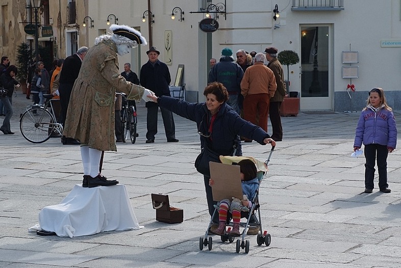 In questo caso il "legame" con la passante, contesa tra l'artista e il passeggino, ha creato una scena buffa. Ne risente un poco la sovrapposizione con la folla dietro, che forse una diversa focale avresti reso meno invadente.