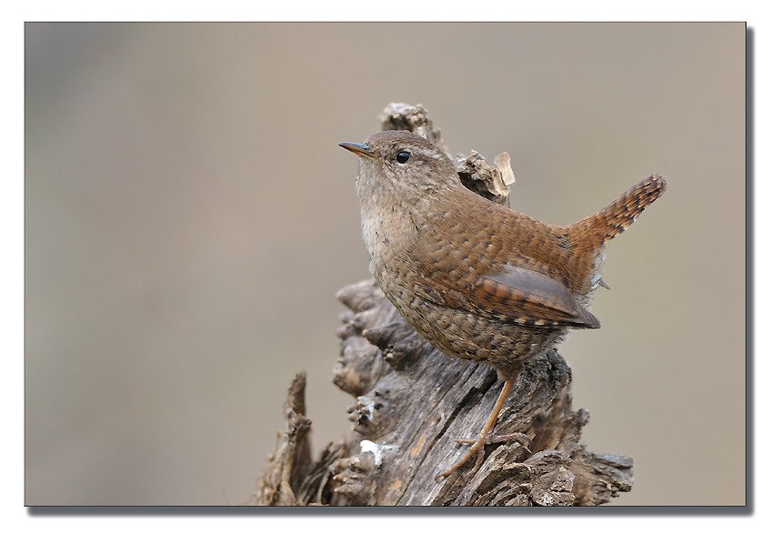 lo scricciolo si sovrappone parzialmente al tronco e non spicca quanto potrebbe se ci fosse un po' d'aria tra lui e il posatoio ( che mi sembra ottimamente scelto )