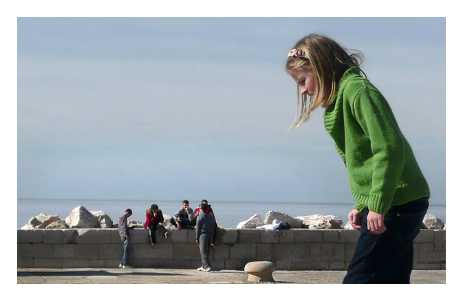 @Biancoenero: l'hai letta come una foto fatta alla bambina, e la tua critica in quel senso sarebbe correttissima. In realtà tutto è subordinato al gioco prospettico, anche se, come ho detto prima, non è riuscito bene come altre volte. Il motivo, principalmente, era il fatto che mi trovavo pure io su un molo, quindi non avevo spazio per indietreggiare e ho dovuto scattare con una focale media (70mm). A questo punto risulta più difficile schiacciare i piani, e l'inquadratura si allarga, da cui la necessità di un forte crop per eliminare i riferimenti dimensionali... e imbarcare un sacco di "rogne"