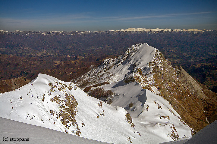 dalla cresta del monte Pania, Alpi Apuane, P gli alpinisti del soccorso Alpino che effettuano esercitazioni mi sembrano delle piccolo formichine........ in primo piano la Pania Secca mentre sullo sfondo si puo' ammirare l'Appennino Tosco Emiliano.