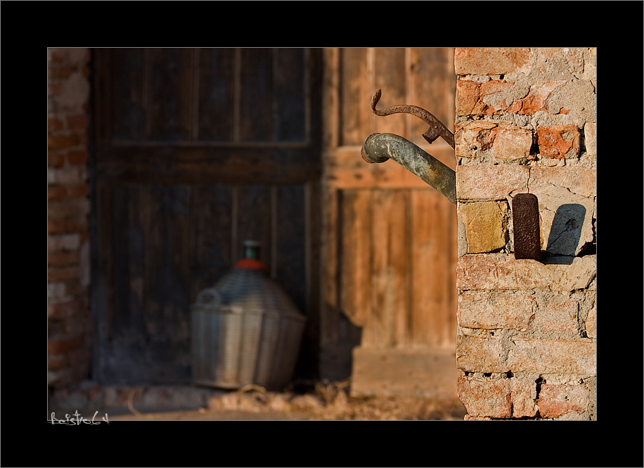 Ciao baistro, altro ottimo lavoro e se proprio vogliamo trovarvi un difetto sta nella damigiana. Il cesto di plastica stona, ma al contempo suggerisce che il luogo è di recente disuso. |