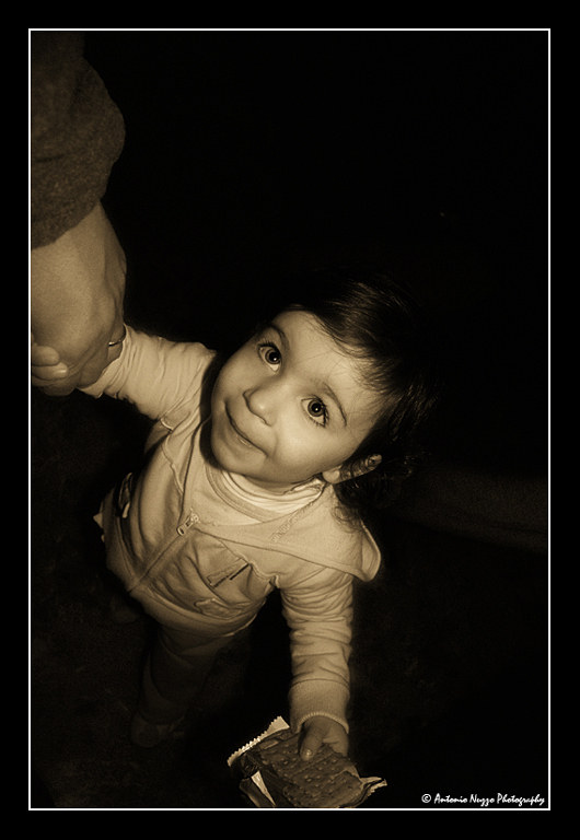 Uno scappellotto simbolico per aver tagliato l'angolo della merendina (? )che la piccola tiene in mano . Generalmente il colpo di flash non mi entusiasma, ma qui l'ombra finisce per avvolgere di conseguenza il gesto del ritratto, in guisa di forte vignettatura , come a voler mimare una piccola rappresentazione teatrale , per nostro uso e consumo.