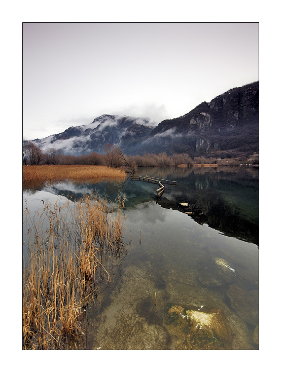 La composizione è impeccabile,segnata da quella linea di erbe secche che continua nel ponte semisommerso,fino su,oltre i monti in un cielo presago dai toni dolenti e belli che disegnano una vignettatura naturale.