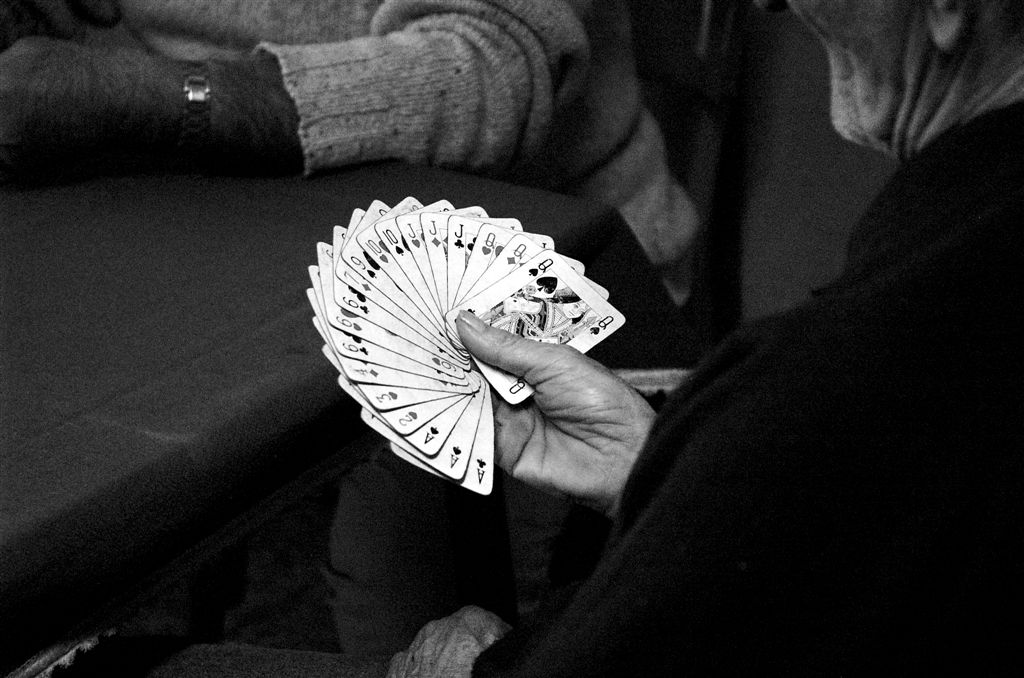 Per me la foto finisce con il perdere interesse entro pochi secondi dopo averla vista, proprio perchè la trovo fortemente statica, per le scelte compositive adottate. Si presenta poco accattivante, manca di quella dinamicità che invece mi aspetto in una partita a carte tra anziani. Il B/N pone tutta l'attenzione sui bianchi, rappresentato dalle carte la cui centralità nel fotogramma blocca del tutto lo sguardo dello spettatore. Si aggiunge inoltre il bianco estraneo, e quindi di disturbo, del riflesso dell'orologio al polso.