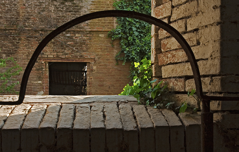 A me invece colpisce molto la cornice ferrosa con cui chiudi, circoscrivi la bella scena...un arco color ruggine...quasi a voler raffigurare una paura atavica nello sporgersi...oppure una sorta di rappresentazione visiva di un qualche ricordo...quasi che questa bella "cornice" volesse raccontare più che circoscrivere...un abbellimento tuo personale alla scena...sinceramente mi piace...soprattutto crea un gioco geometrico con la scala appesa visibile e "incorniciata" anch'essa dal portone di fronte...