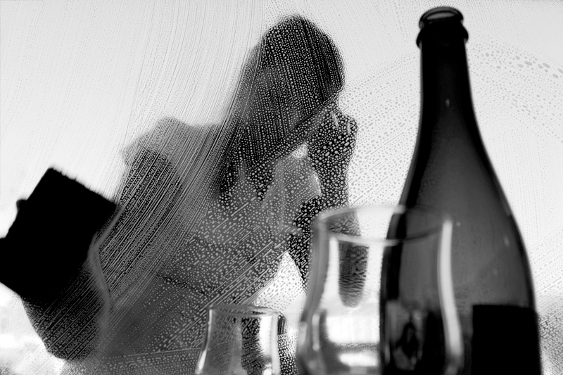 L'interpretazione è sicuramente soggettiva ma non vedo il perchè non poter costruire una valida storia street con questi elementi che AlexKC ci propone: proprio da quella bottiglia e da quei bicchieri ancora puliti che tanto occupano il fotogramma, ripresi all'interno di un locale e  con lo sfondo pervaso da questo personaggio, senza identità  ed in pose espressive.