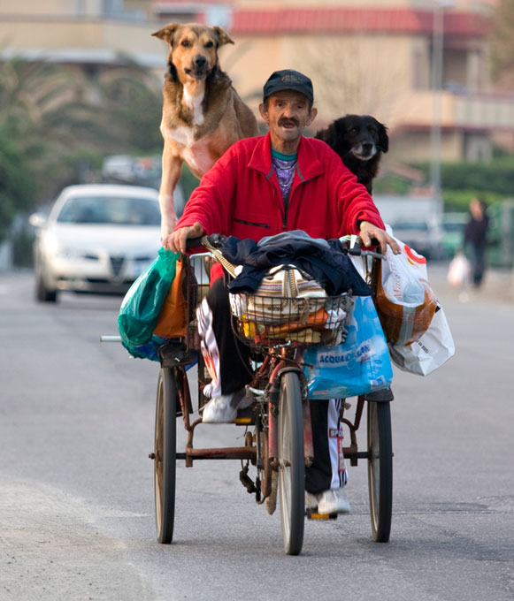 Una maggiore nitidezza, assieme a una maggiore vivacità dei colori, renderebbero lo scatto ancor più interessante. La centralità dell'insolito trio e lo sfocato dello sfondo portato dalla profondità di campo, inquadrano quest'inusuale quadretto di vita in maniera senz'altro gradevole, cogliendo in maniera piacevole un istante che forse sarebbe stato valorizzato diversamente (non necessariamente meglio) da un taglio orizzontale (a patto di non introdurre così eccessivi elementi di disturbo). E' uno scatto che nasce a colori (visto a colori, e quindi ogni post-produzione porterebbe al più un bel bianco e nero ma non un buon bianco e nero), e che nei colori ha insieme un punto di forza (concretizzano la figura contestualizzandola e rendendola variopinta e dunque più espressiva) e un punto debole (la scarsa nitidezza pesa molto, nella resa quasi slavata di questi contrasti cromatici altrimenti più equilibrati).