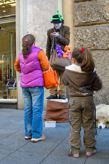 Per me è una foto che trova la propria forza nelle accoppiate cromatiche. La bambina a sinistra è vestita con le stesse tinte dei palloncini, mentra l'altra indossa degli abiti che hanno una tonalità di marrone simile a quelli che porta l'artista. L'interno del cappuccio di quella a destra ricorda la pelliccia del cane (che avrei cercato di non tagliare)