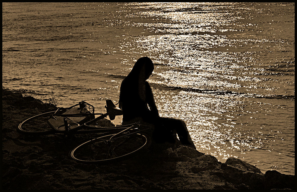...ben evidenziata dalla lavagna luminosa la figura della ragazza, curva sui suoi pensieri, illuminata dal riverbero e posizionata nella parte scura invece la bicicletta.