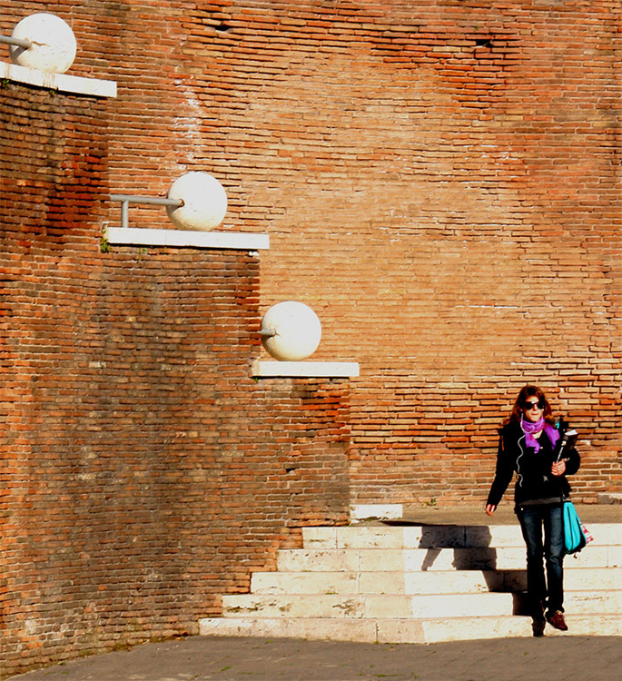 Ciao, i piani sembrano schiacciati(a che focali eri?) e la foto è sovraesposta grazie anche al sole a picco che non ti ha aiutato, ne ha risentito il travertino delle palle e dei scalini . Bello il rosso ruggine del muro e interessante l'ombra, ma la foto in sé a me non dice nulla.