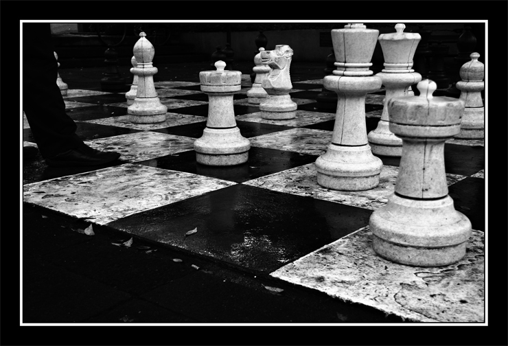 Forse estremizzare meno il contrasto o provare un recupero delle ombre sulla parte di scacchiera su cui si staglia.
