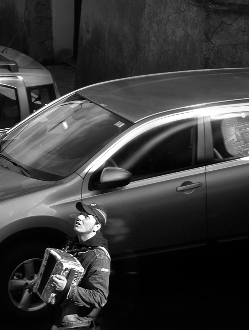 Il ragazzo è un suonatore di strada, ma anzichè starsene fermo suona sotto ai palazzi e aspetta che gli si getti qualcosa dalle finestre (praticamente tutto il tempo con il naso all'insù). Ho provato a rendere il punto di vista dell'ominide che si affaccia e lo intravede, magari chiedendosi se gli danneggerà il fiammante SUV posteggiato sotto casa.. quindi a) distanza dalla scena b) collocazione marginale e non canonica del protagonista c) punti di bianco volutamente ambigui d) vetro chiuso (reso dal riflesso) ad aumentare ancora di più la separazione