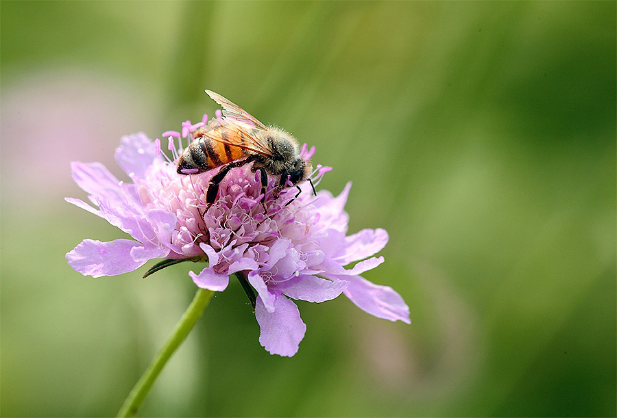 Preferisco la seconda anche se la composizione sia da rivedere, ma occorre ricordare quanto il soggetto sia difficile data la sua continua mobilità anche quando raccoglie il polline. Hai saputo renderlo ben nitido nella brevissima frazione di secondo che ti ha concesso.