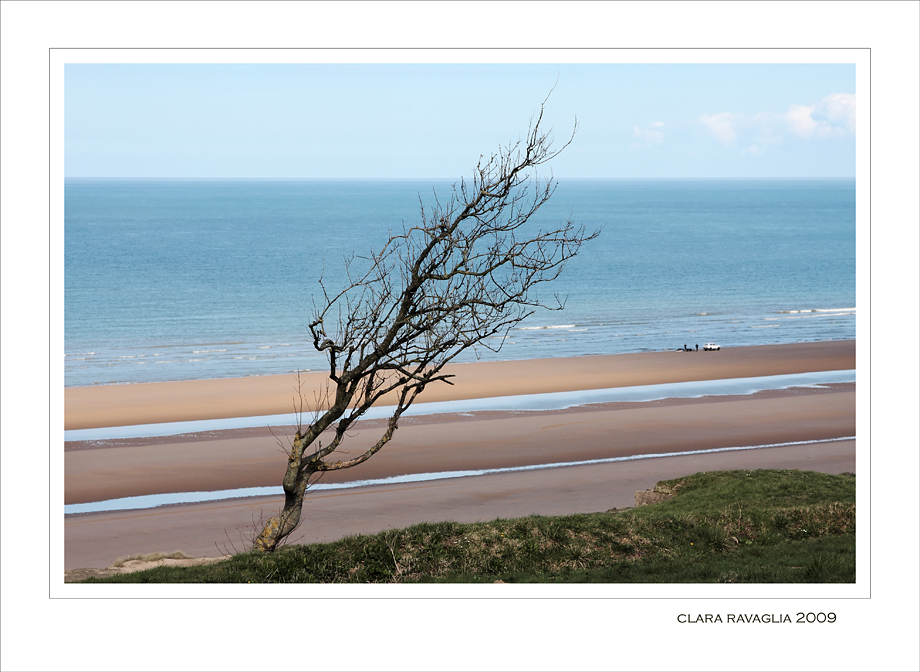 Però forse sai che io sento al 99% a colori, ed inoltre qui ho scattato più per il contrasto fra il tormento geometrico di questo alberello davvero piegato dal vento oceanico e la dolcezza di queste tinte pastello in sfondo: considera che si tratta della spiaggia del D-day,dove la storia è passate nel sangue. Ecco perché ho visto questo contrasto e questo alberello un po' simbolico, più che protagonista in se stesso.