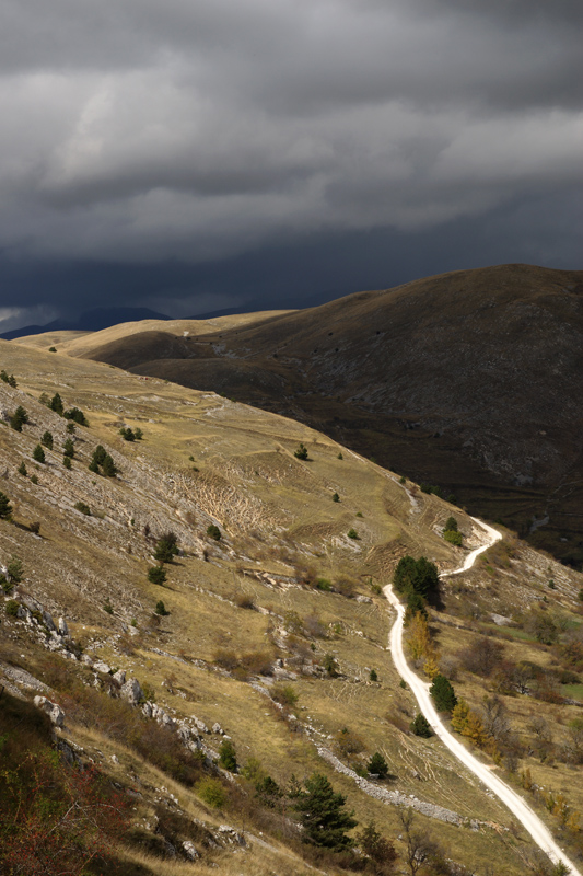 Belli i giochi di ombre e luci dovuti al cielo foriero di temporale, la stradina bianca sulla collina mi piace tanto....