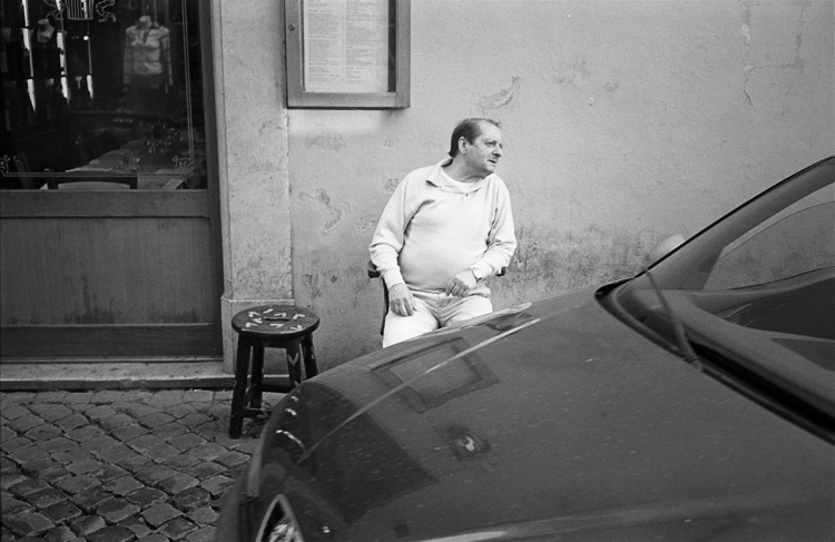 Si realizza una scenetta abbastanza comica sfruttando uno dei maggiori elementi di disturbo in una street, l'auto parcheggiata. Buona la posa, che mi immagino rivolta al proprietario della vettura che gli si è piazzata davanti, privandolo della visuale.