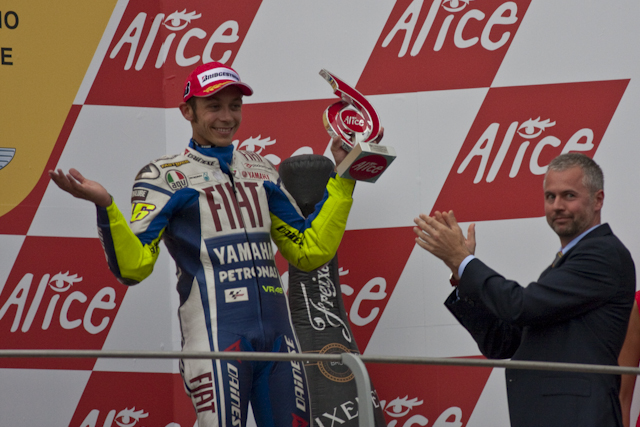 La foto di se non è niente di particolare, colori, nitidezza ecc.... Mi piace però l'espressione colta di un Valentino che sembra dire "...Mi dispiace ragazzi, so che al mugello avremmo voluto festeggiare, ma meglio di cosi' non ho potuto fare..."