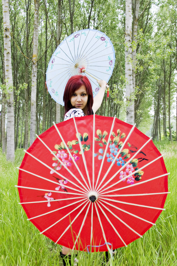Idea e composizone non male ! avrei riempito maggiormente il fotogramma con ragazza ed ombrelli.