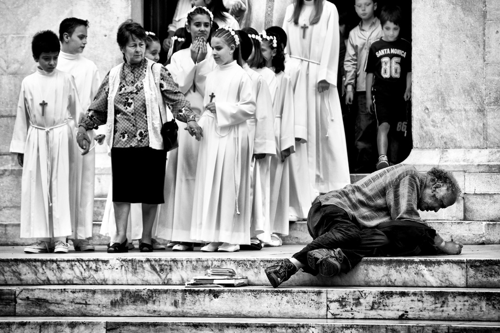 mi stavo divertendo a scattare quanlche foto di quest'uomo, uno scultore, tutto intento a prendere appunti, disegnare, segnare numeri di telefono etc.. sugli scalini del Duomo, quando dietro di lui si è aperto il portone e sono usciti i neo-comunicati guidati dalla perpetua (si chiama ancora così?). ovviamente non mi sono lasciato scappare l'occasione! sono stato fortunato a cogliere la varietà di espressioni di chi, appena ricevuto il corpo di Cristo e quasi in odore di santità, si è trovato il cammino sbarrato da cotanto scempio!