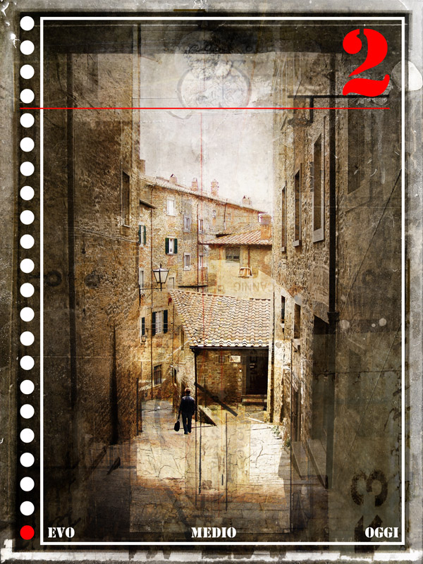 In questo caso, la linea temporale suggerita dalle tre parole poggiate sul filo basso suggerisce la lettura della scena, come di qualcosa intrappolato indietro nel tempo che ci accingiamo a guardare oggi, gettando lo sguardo in questo vicoletto..