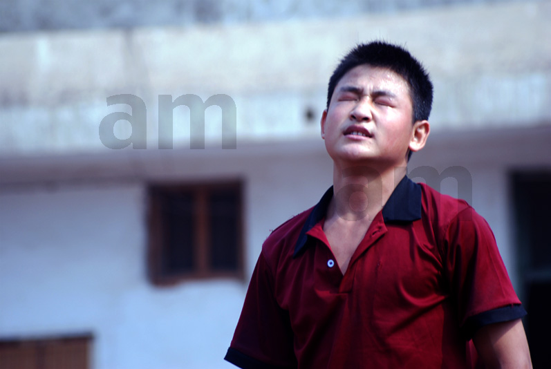 ...nel viso del ragazzo (di una scuola di kung fu cinese) si delinea la stanchezza, dopo la fine di un'estenuante allenamento.