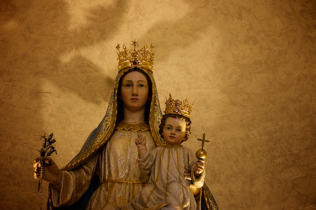 Ho scelto questa soluzione proprio per far entrare nell'inquadratura le ombre "giocose" alle spalle della statua e creare un contrasto con la sacralità della Madonna.