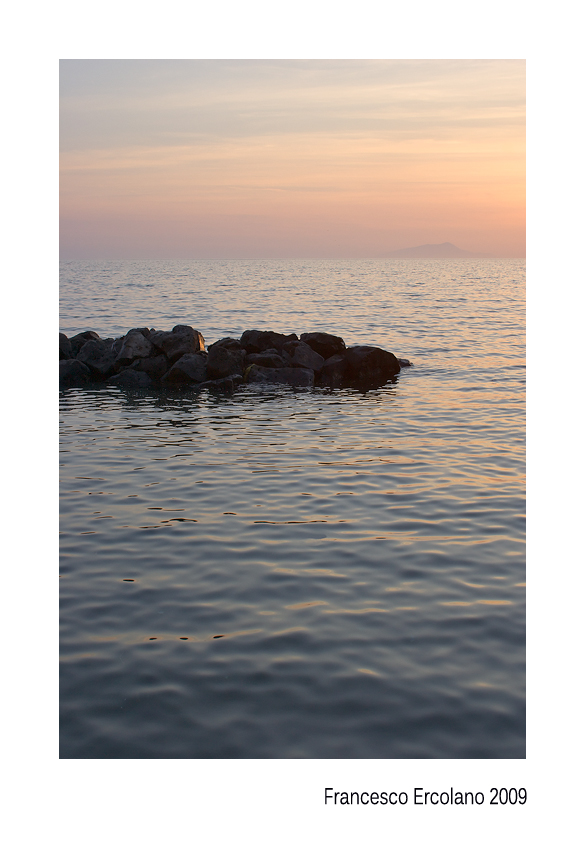 Delicato in modo incantevole il colore, con l'isola evanescente che si nasconde nella foschia rosata. Vedo che anche tu hai avuto dubbi sulla composizione; mi domandavo se non sarebbe meglio tagliare via quasi una metà della parte in basso, portandosi a un formato quadrato.