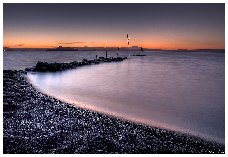 E' incantevole l'effetto setato che ha assunto l'acqua dalla lunga esposizione la quale, giocando con le calde tonalità del tramonto, ci regala un paesaggio dai colori fantastici.