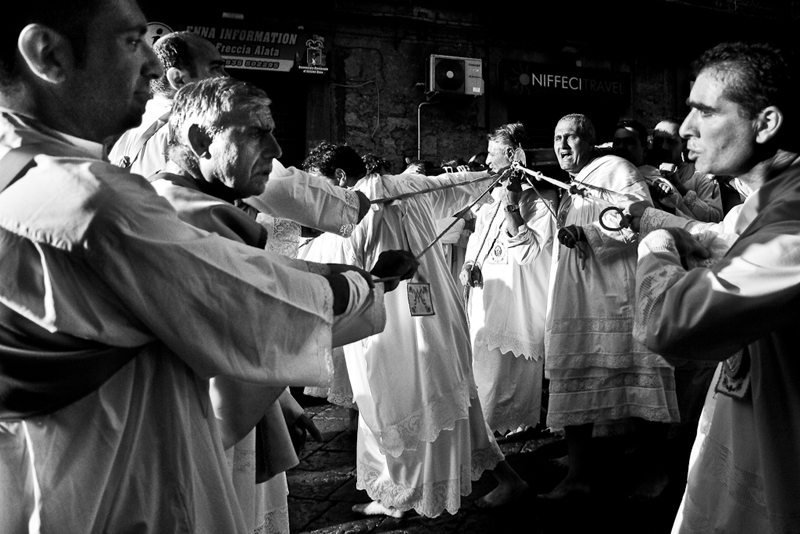 Enna-Santa Maria della Visitazione-come in ogni buona festa siciliana che si rispetti,nascono delle incomprensioni all'interno del corteo..in questo caso, i due ai lati litigano mentre l'uomo centrale li richiama all'ordine e al silenzio della processione. _________________ Canon 40 d - Canon 300d - Samsung pro 815 |