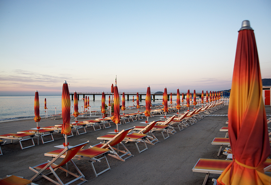 Un bel gioco cromatico fra i colori squillanti di ombrelloni e sdraio in contrapposizione alle tenui tonalità del cielo.