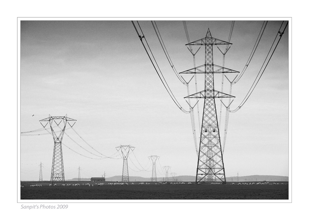 | Una struttura che valorizza parecchio la presenza dei tralicci e che grazie ad un inconsueto gregge sparpagliato fa assumere all'immagine un carattere paesaggistico. Forse cercherei un pelino di contrasto in più del bianco e nero, ma è anche questione di gusti. Ciao Tiziano