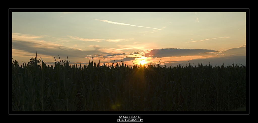 l'orizzonte tra il cielo e le piante è a metà, se volevi sottolineare il cielo dovevi abbassare l'orizzonte. Se volevi sottolineare il campo dovevi alzare la macchina e prendere meno cielo.